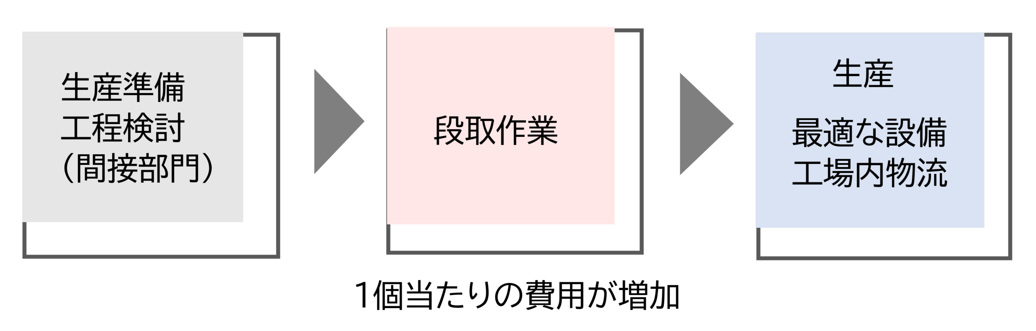 しかしまとめ生産した方が原価は低くなります。置き場所や在庫品管理の問題はあるため、大量に在庫するのは問題ですが、数日分をまとめ生産するのは原価低減に効果があります。