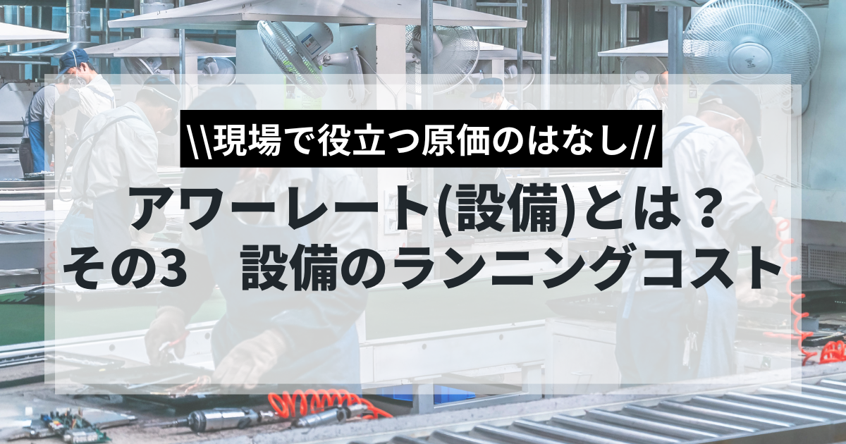 設備のランニングコストは、使用・維持で発生する変動費です。電気代、消耗品、修繕費、保守契約料などが含まれます。製品生産に比例するものは材料費、設備稼働に比例するものはランニングコストと区別します。電気代は実測か定格から推測し、高額な修理費は定期的なもののみランニングコストに含めます。これらを適切に計算することで、アワーレートを正確に算出できます。