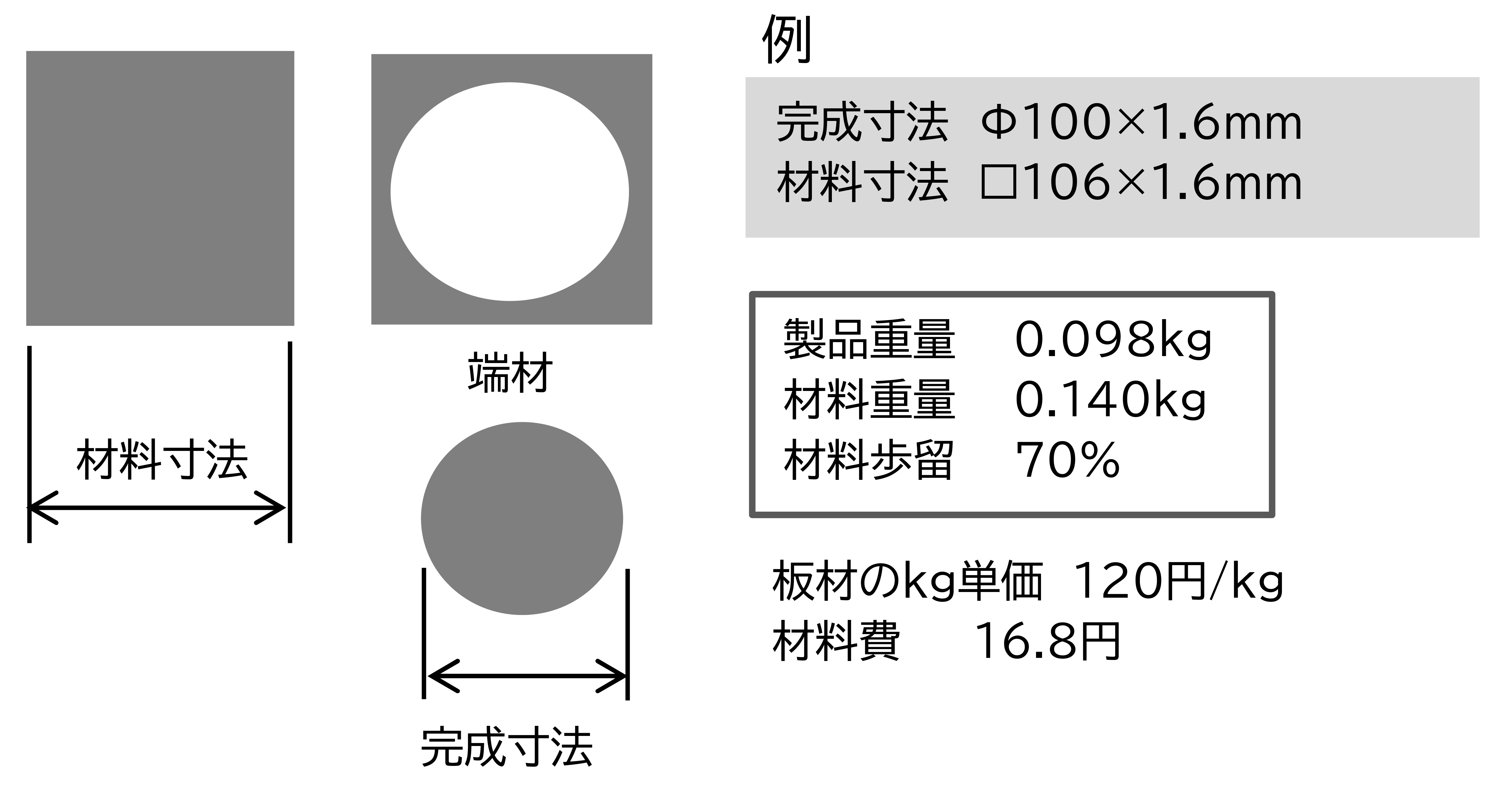 材料歩留 = 製品重量 材料重量 = 0.098 0.14 = 0.7 ≒ 70 %